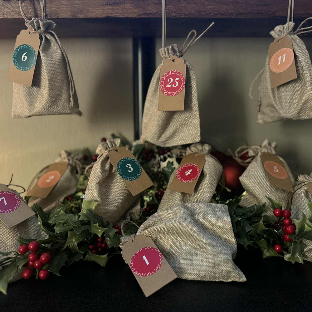 Instead of the traditional boxed calendar, this advent is packaged in individual handy hessian bags which you can unbox to display along your mantel or even hang on your tree!